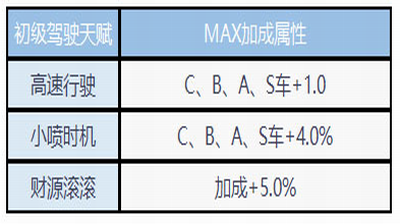 【初级驾驶天赋】考取初级驾照后解锁,包含高速行驶、小喷时机和财源滚滚。高速行驶提升平跑最高速度,小喷时机延长小喷持续时间,财源滚滚增加金币与经验收益。每项技能需金币升级,高速行驶与财源滚滚最高5级,小喷时机最高4级。适用C、B、A、S级车辆,覆盖广泛。
