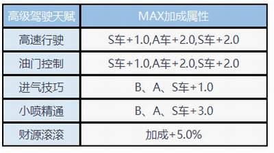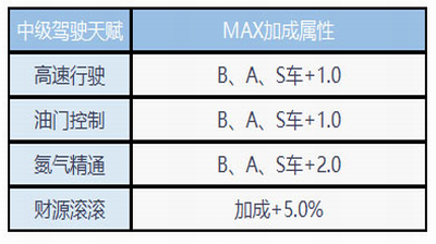 【中级驾驶天赋】解锁中级驾照后激活,分高速行驶、油门控制、氮气精通和财源滚滚。高速行驶与财源滚滚功能同初级,但仅适用B、A、S级车。油门控制提升加速度,氮气精通加快氮气积累。所有天赋最高5级,金币升级强化效果。