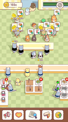 1、游戏员工以可爱的小动物为主,不同品种的猫咪拥有独特能力,如敏捷服务或高效烹饪。玩家可以安排它们在合适岗位,优化餐厅运营。