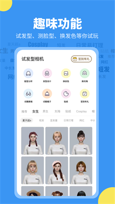 1、发型试戴功能:只需上传一张正脸照片,就能尝试超过1000款发型,涵盖男士发型和女士发型。无论您想换新发型还是测试现有发型是否合适,只需在首页点击图片即可启动此功能,操作直观高效。