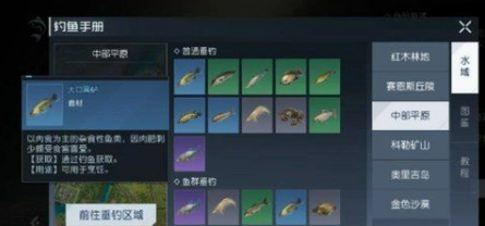 2、在钓鱼手册内,定位到中部平原、科勒矿山或金色沙漠的鱼类列表,找到大口黑鲈条目,点击左下角的【前往垂钓区域】按钮。系统将自动导航至目标水域,节省玩家探索时间,提升行程效率。