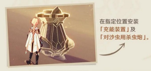 接下来,在指定位置安装「充能装置」及「对沙虫用杀虫炮」。位置通常标记在地图上,靠近沙虫出没区域。安装过程简单:靠近目标点,点击互动键即可。确保角色站位安全,避免被沙虫干扰。安装后,装置会激活,但需要后续充能才能发挥最大效用。